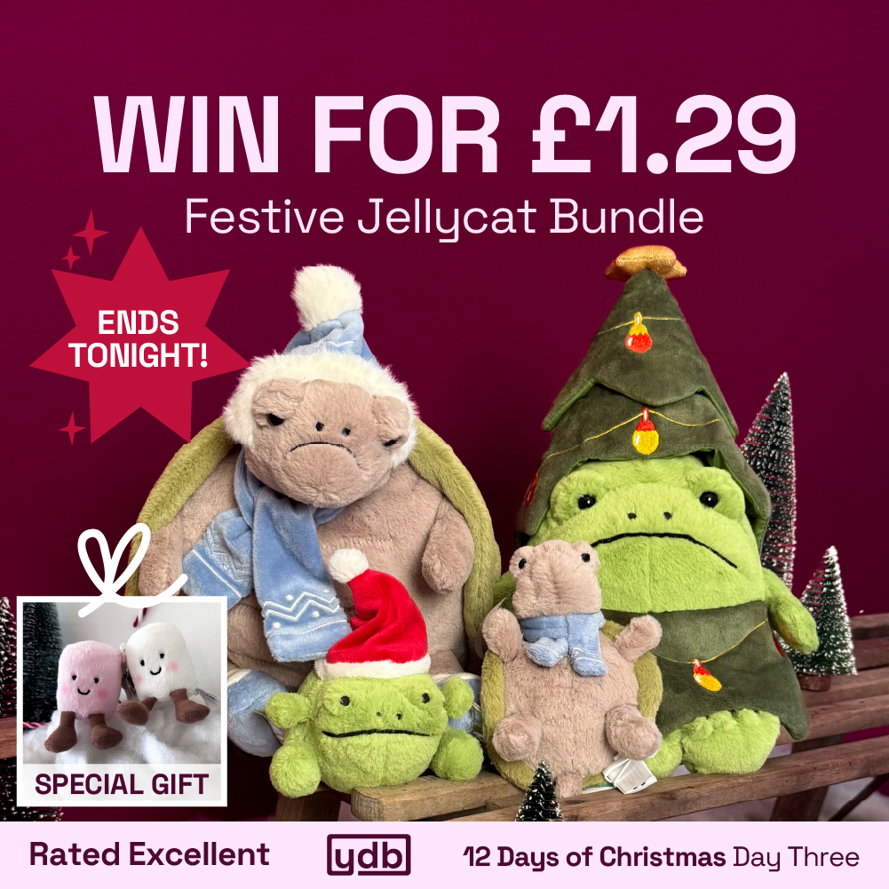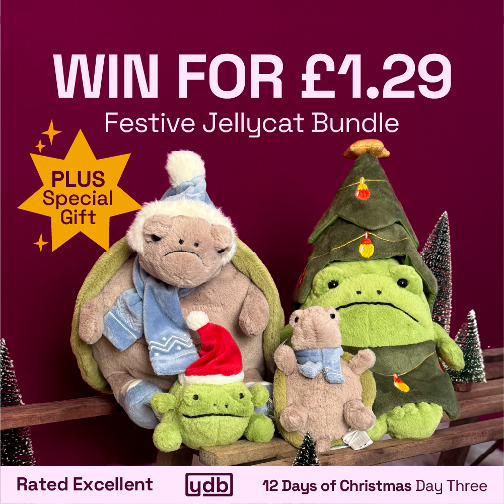 We’re on Day 3 now, and we’re bringing this super adorable bundle! Introducing the gorgeously grumpy faces of Jellycats’ very own Timmy Turtle and Ricky Rain Frog, dressed in all their Christmas glory. AND, the winner will also receive Christmas decorations of the original Timmy and Ricky, too. So, while they might not look pleased to be here, we’re ever so happy they are. They’ve brought a lot of joy to YDB HQ.